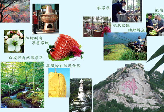 享有"京西小黄山"之美誉,风景区三季有花,四季有景:春有"桃源杏海"、"怡桥春照";夏有"银练碎玉"、"白瀑垂帘";秋有"深秋红叶"、"金果飘香";冬有"层峦睛雪"、"白玉倒悬"。是春游踏青、夏令避暑、秋赏果熟、冬观雪景的胜地。中线以古刹龙泉寺为中心,沿山而行可观古东方养生文化修炼场和有着动人传说的荫晾亭及北京摩崖刻字"凤凰岭";南线以金章宗时期的京西"八大水院之一的黄普院(圣水院)为中心,有金刚石塔和佛教造像"北魏石佛"、吕祖洞和古香道(妙峰山进香"老北道")遗址;北线则以峰奇、石怪、水美、洞幽取胜;有誉为华山之险的"天梯",神秘幽深的古猿洞,"神泉"和"垂帘飞瀑"等妙景。阳坊涮肉
